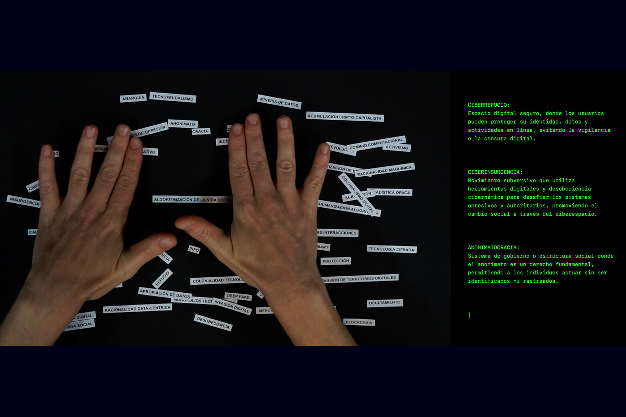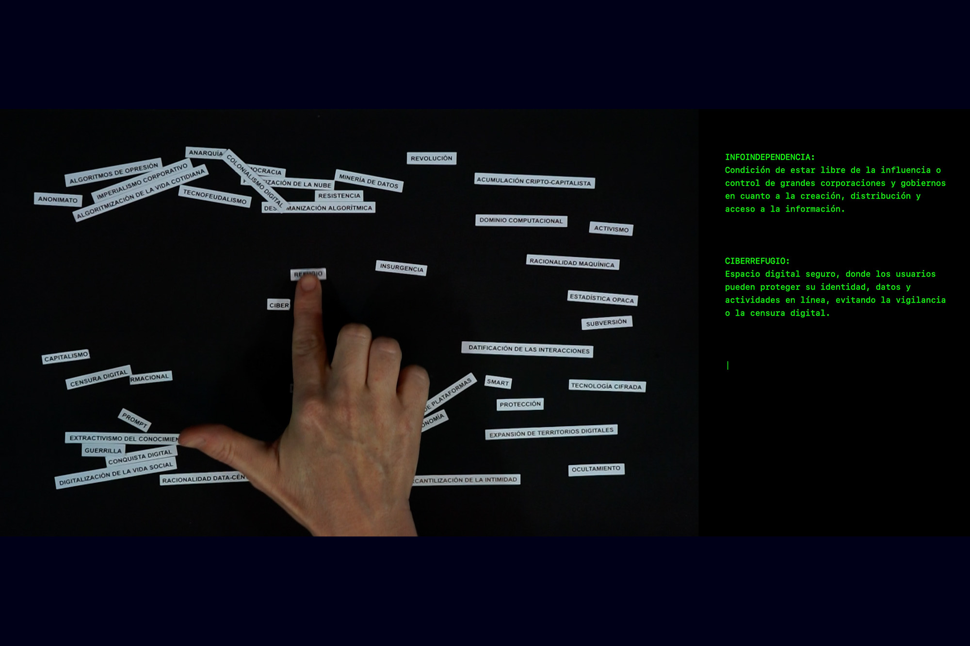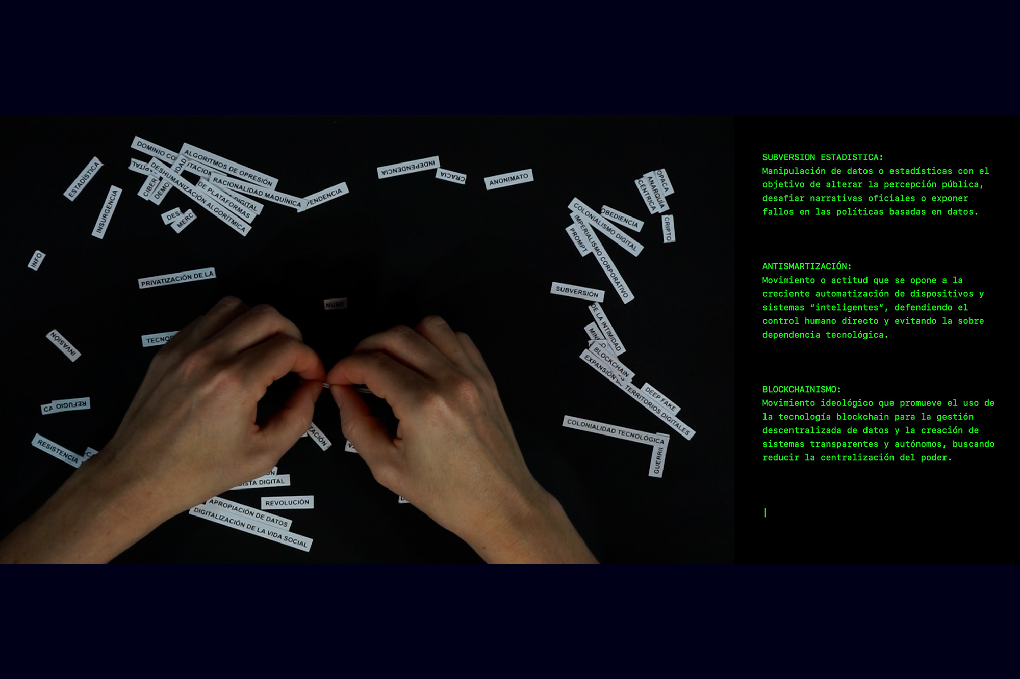 Un conjunto de términos existentes da pie a una interacción lúdica y analógica con el propio lenguaje, donde las palabras son fragmentadas y reconfiguradas para dar paso a la creación de nuevos conceptos. Este ejercicio se presenta en un diálogo simultáneo con una inteligencia artificial que se empecina en definir, a tiempo real, todas aquellas palabras que detecta como nuevas.